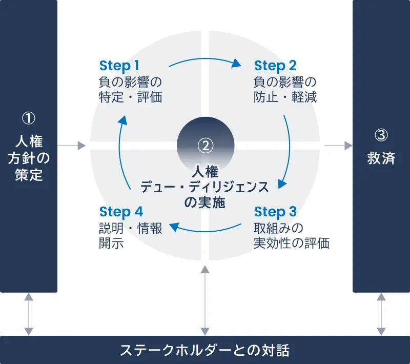 - 私たちは、国連の「ビジネスと人権に関する指導原則」に則り、人権方針の策定、人権デュー・ディリジェンスの実施および救済メカニズムの構築に積極的に取り組みます。